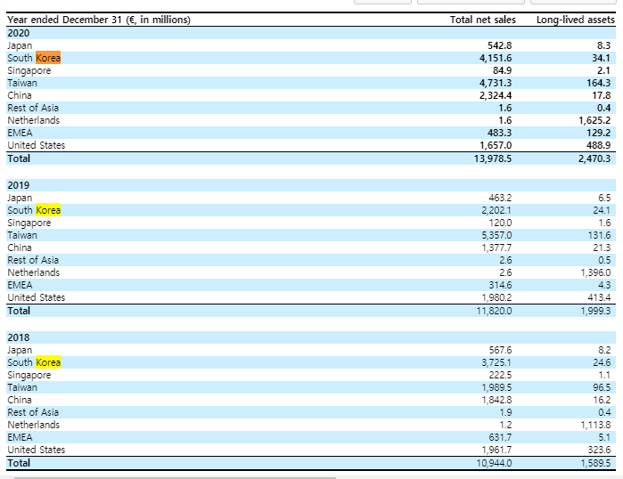 그러면 ASML(네델란드)도 한국매출액도 궁금해진다.^^ 한번 볼까?