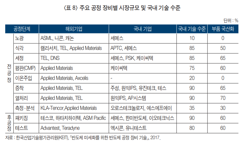 지난해 반도체 장비 수입액은 155억달러를 넘어, 휴대전화 수출액의 1.1배에 달한다. 주요 수입국은 일본(45%), 네덜란드(25%), 미국(24%) 등이다. 장비 수출은 35억 달러이지만 대부분 국내기업의 해외 공장(삼성시안,SKhynix Wuxi)으로 공급하는 비율이 높다. 반도체 소재에서 일본 의존도는 50%에 육박한다. 반도체 생산에 필요한 장비와 소재산업을 놓고 살펴보면 첨단공정에 투입되는 핵심 장비 대부분을 외국 업체들이 독점하고 있다. 더욱이 한국 업체들이 집중하는 '후공정'의 경우 '전공정' 대비 기술 장벽이 낮아 중국 업체들의 추격이 거세지고 있다."