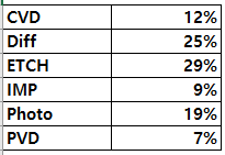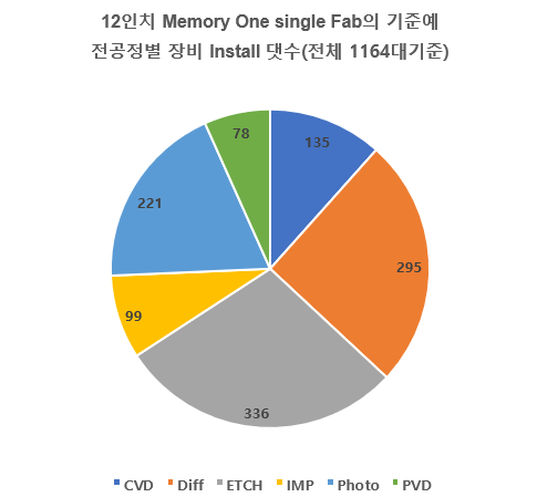 이 통계는 전체팹안에 점유하고 있는 장비의 셋업댓수의 점유율만 보는것이다. Etch와 Diffusion쪽이 상위에 분포하고 있고. 이 숫자의 의미는 반대로 생각하면 1개의 메모리Fab을 만드는데 대략1164대분의 장비발주서(PO:Purchasiing Order)가 구매발주가 나왔다는 의미이며, 셋업이 된 장비댓수의 의미는 장비제조업체의 관점에서는 Install base Number reference로 보면 장비제조사 입장에서는 아주 중요한 Value를 가진다.