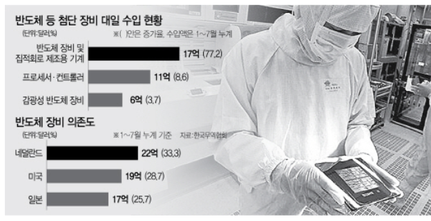 또 지난해 반도체 장비 수입액은 155억달러를 넘어, 휴대전화 수출액의 1.1배에 달한다. 주요 수입국은 일본(45%), 네덜란드(25%), 미국(24%) 등이다. 장비 수출은 35억 달러이지만 대부분 국내기업의 해외 공장으로 공급하는 비율이 높다. 장비 수입액이 수출액보다 4배가 넘는 것이다. 반도체 소재에서 일본 의존도는 50%에 육박한다. 국내에서 반도체 소재에서 가장 큰 비중을 차지하는 실리콘 웨이퍼의 수입액은 지난해 16억1000만 달러를 기록했다.