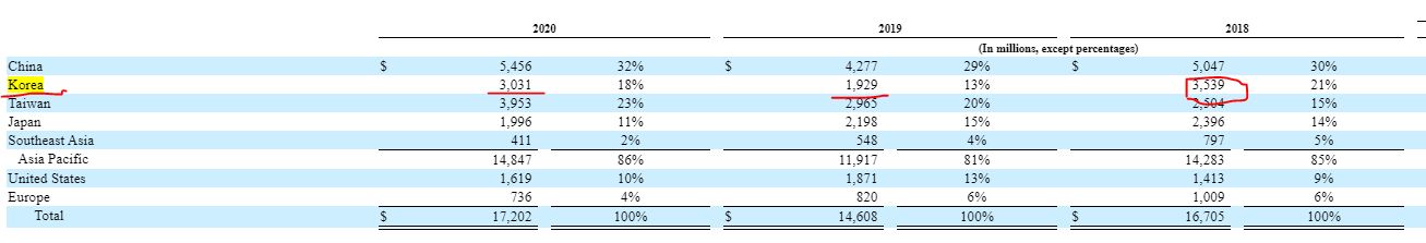 그러면 Applied Material의 Investor info 10K로 3년동안 얼마나 한국에 장비를 팔았는지 더 찾아보자.