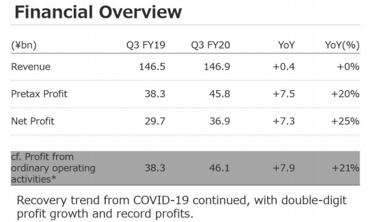 2021년 1월에 Release(2020년 3분기)된 가장 최근 결산자료를 보면, 1460억엔(1조5천2000억원)에 Net Profit은 369억엔(4160억원)으로 YoY(%)가 매출액기준 20%, Net Profit기준으로 +25%성장하였다. 2019년 대비 70억엔 증가하였다. Corona사태에도 상당히 좋은 실적을 거두었다.