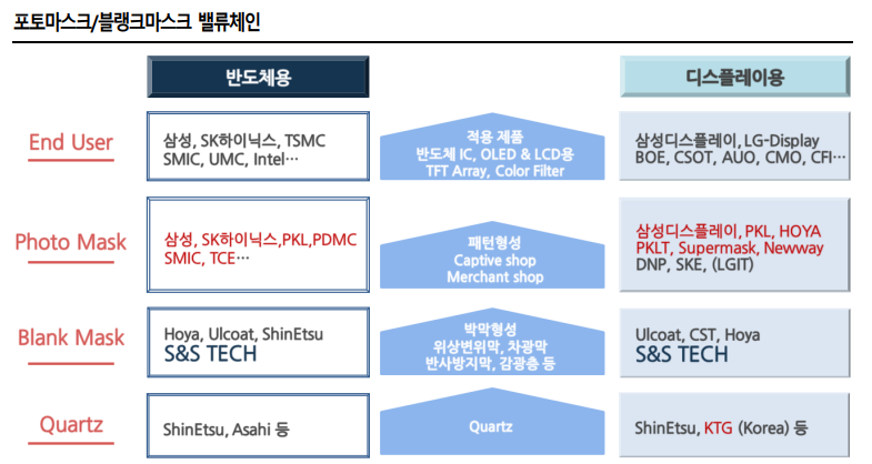 우리가 잘아는 안경유리로 유명한 Hoya(일본호야),AGC(아사이글라스),신에츠,미츠이화학,Ulcoat(ULVAC의 자회사)등이 대표적이며, 국내에서는 S&S TECH가 유일한 공급업체이다. SKC가 작년에 One pathline 투자를 완료하고 고객Qual을 준비중이다.